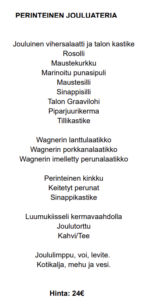 Wagnerin perinteinen joululounas, jossa kunnon kinkku on pöydällä ja muita perinteisiä herkkuja. Ryhmävaraukset helpottavat suunnittelua joten varaa ajoissa paikanne!